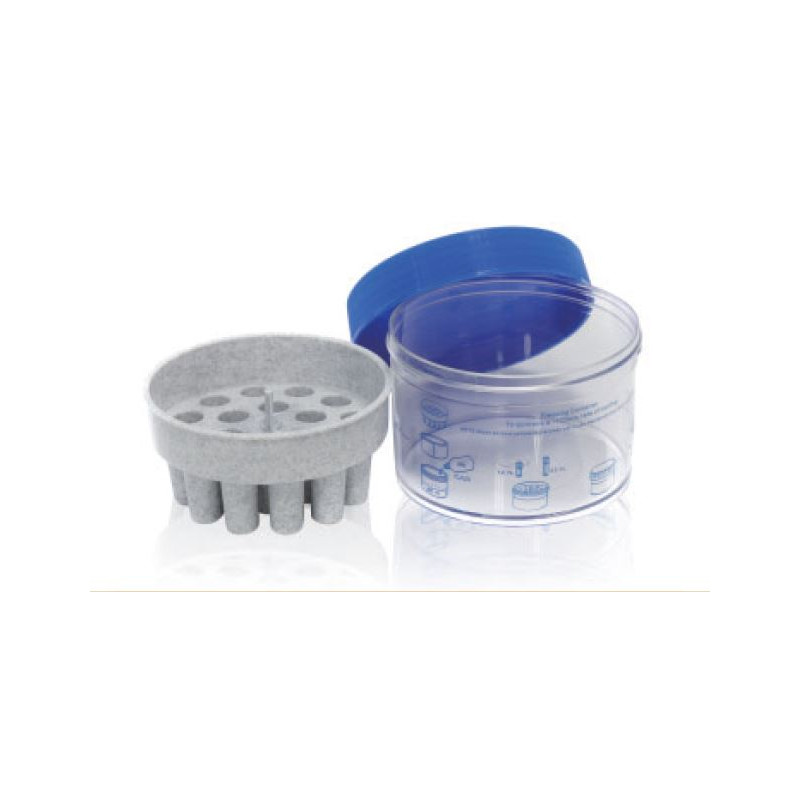 Штатив для замораживания криопробирок, вместимость 12 криопробирок на 1-2 мл, работает без применения спиртов и растворителей, материал вспененный ПЭ с термопроводящей твердотельной сердцевиной. В сочетании с морозильником на -80°C обеспечивает замораживание клеток с постоянной скоростью -1°C/мин.